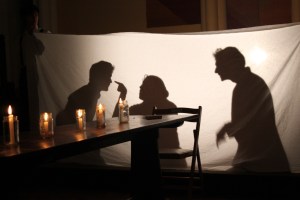 Our take on the Dickens classic, a simple yet effective piece of community theatre, created with other artists in order to help fulfil the expanded cast requirements, all bedecked in the most Victorian of costumes we could find. Much of the performance was done quite simply, such as a song around a piano at Fezziwig’s party; other sections were more theatrical with narration from a performer playing Dickens, or Jacob Marley decked in paper-chains; and some were particularly SourDough in nature, such as the future scenes being played out by shadowy silhouettes.