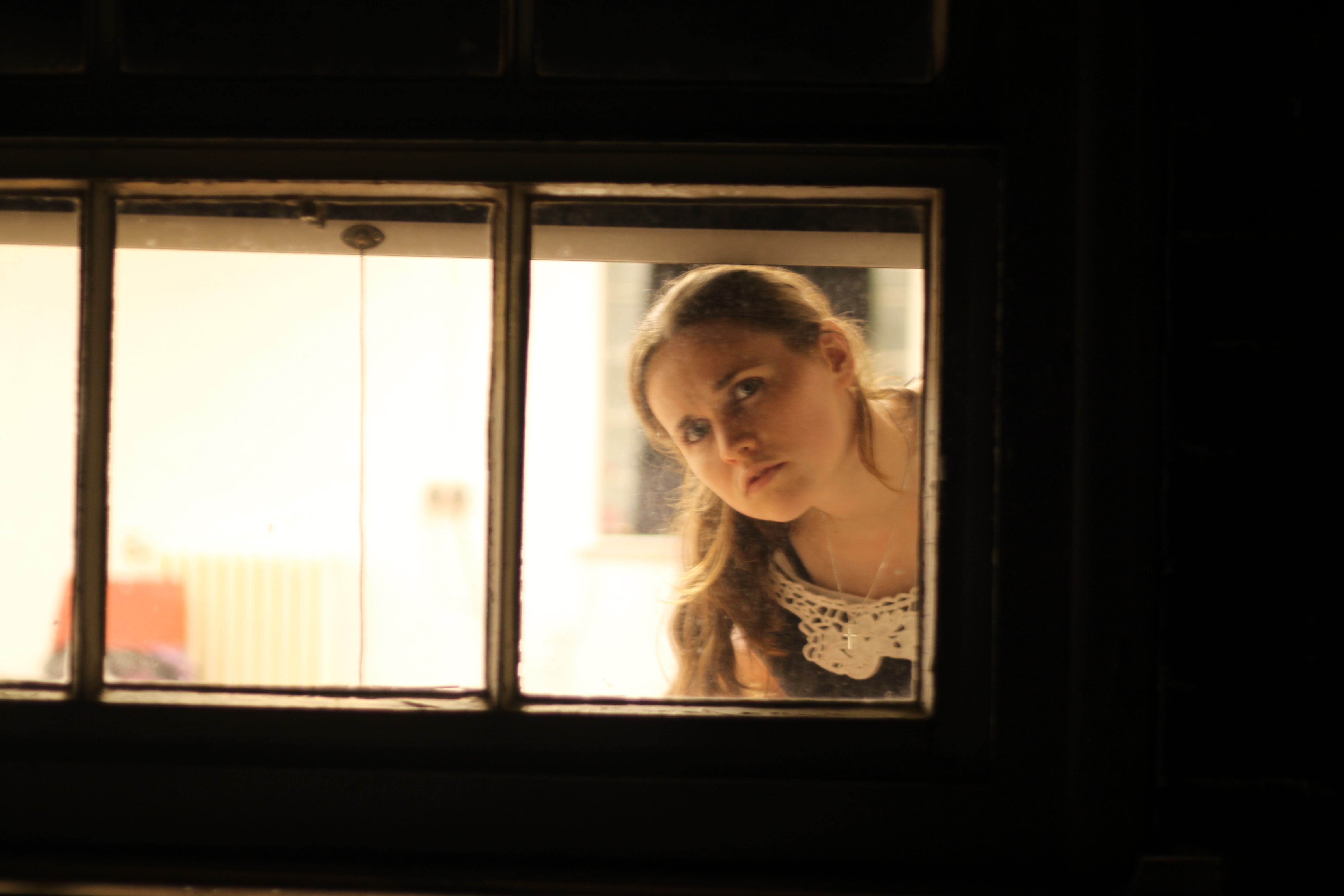 The theatre has a glass corridor leading to the dressing rooms which is visible through windows on the landing. This is where the audience stood, while we set the corridor up as 3 houses next to each other, with 3 sets of curtains and blinds.